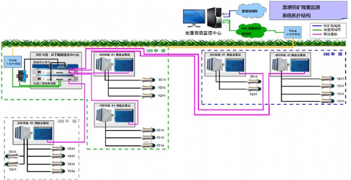 根据客户矿区208中段到616中段等九个中段的地压显现及空区分布情况,在268,388和496三个中段共设计18个检波器,构建24通道的微震监测系统网络。系统结构图如下: